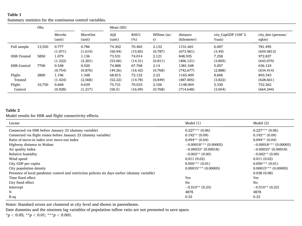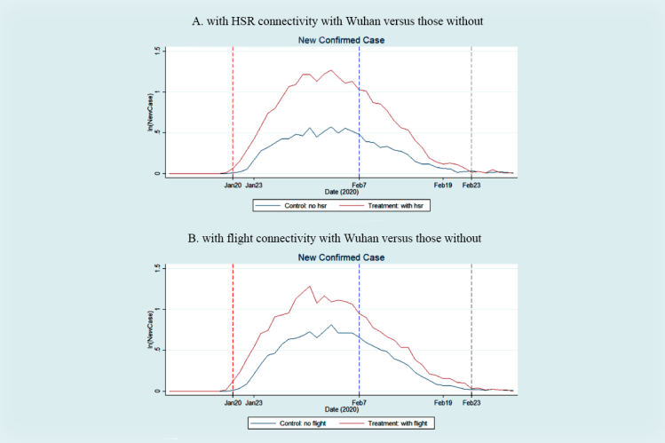 Results: We find high-speed rail (HSR) and air connectivity with Wuhan resulted in 25.4% and 21.2% increases in the average number of daily new confirmed cases, respectively, while their suspension led to 18.6% and 13.3% decreases in that number.