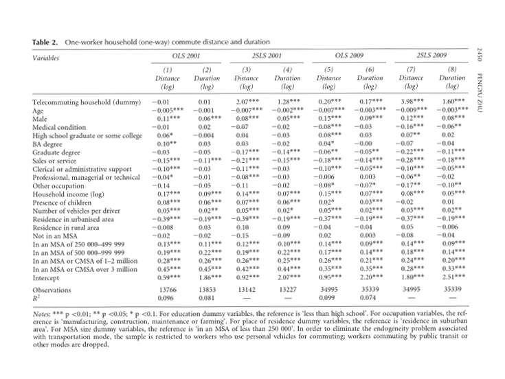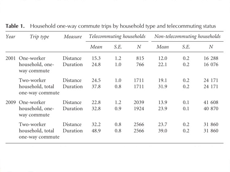Results: These findings suggest that telecommuting (two-worker) households tend to choose locations involving a longer total one-way commute than non-telecommuting households, and this difference is largely due to the longer commute of their telecommuting members.