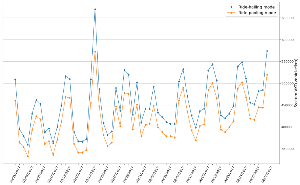 Results: We find that under our initial assumptions, with a buffer time of 60s, ride-pooling has the potential to reduce aggregate VKT by 8.21% as compared to standard ride-hailing mode in a mid-sized city, Haikou. This reduction in VKT is equivalent to a savings of 1,234,164 Liters in petroleum consumption and 3308 tons in carbon emissions annually.