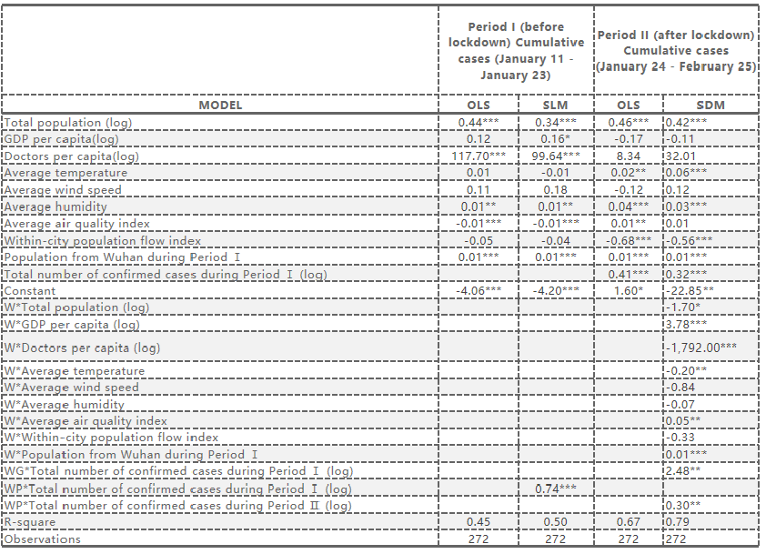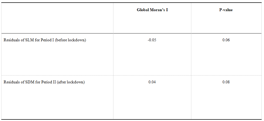 Results: We further compare the performance of the spatial econometric models using different SWMs for each period. Regardless of whether the population-flow-based SWM or inverse distance SWM was used, the global Moran’s I tests for Period I consistently exhibit significantly positive values, confirming the existence of spatial autocorrelation in the dependent variable. However, as mentioned in section 4.3, LM tests and robust LM tests indicate that spatial models (e.g., SLM, SEM) based on inverse distance SWM fail to capture such spatial autocorrelation in the dependent variable and these models perform no better than the OLS model. On the other hand, spatial models using population-flow-based SWM for the spatial lagged dependent variable successfully address the spatial autocorrelation issue, with the model residuals exhibiting no systematic spatial pattern at a 95 percent confidence level.